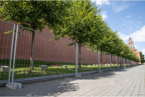 Для возведения ограждения необходимо расставить бетонные основания, установить собранные из панелей и столбов секции и скрепить их креплениями для временных ограждений.